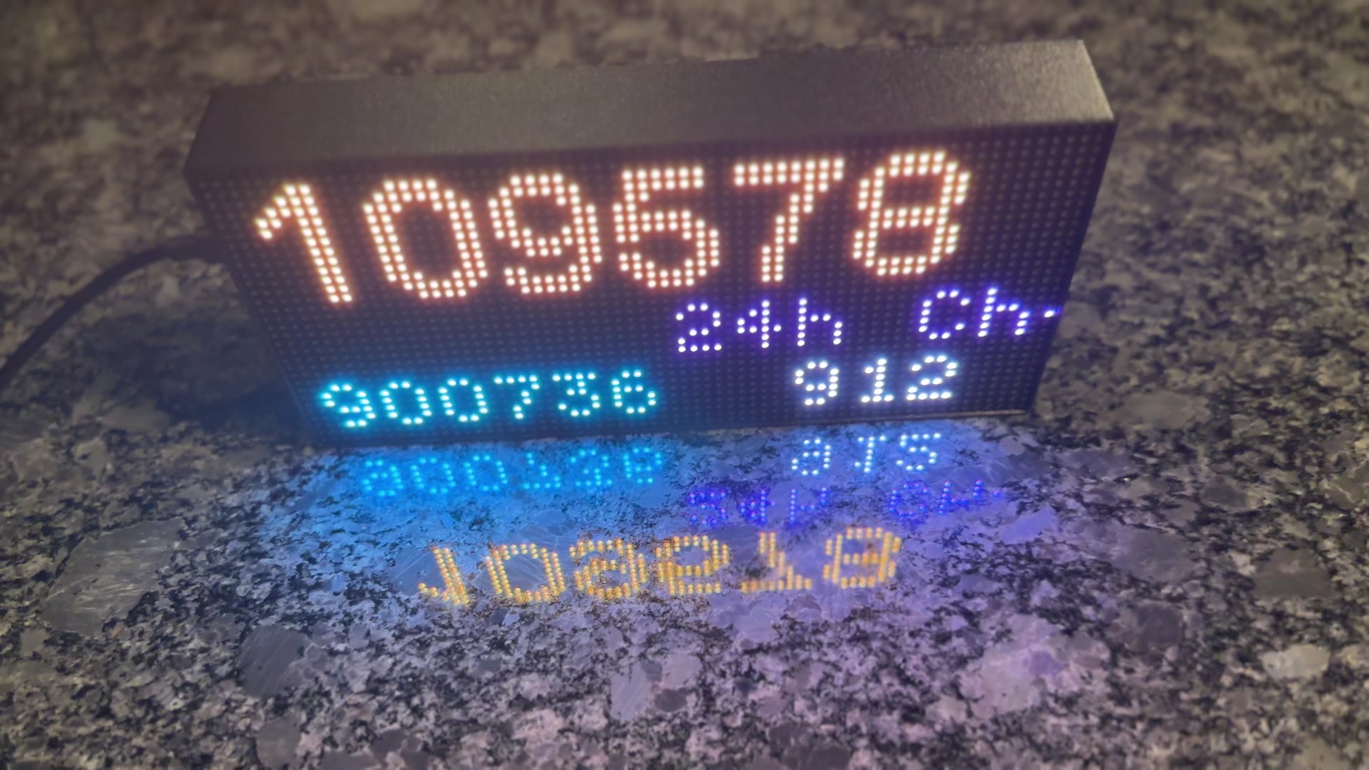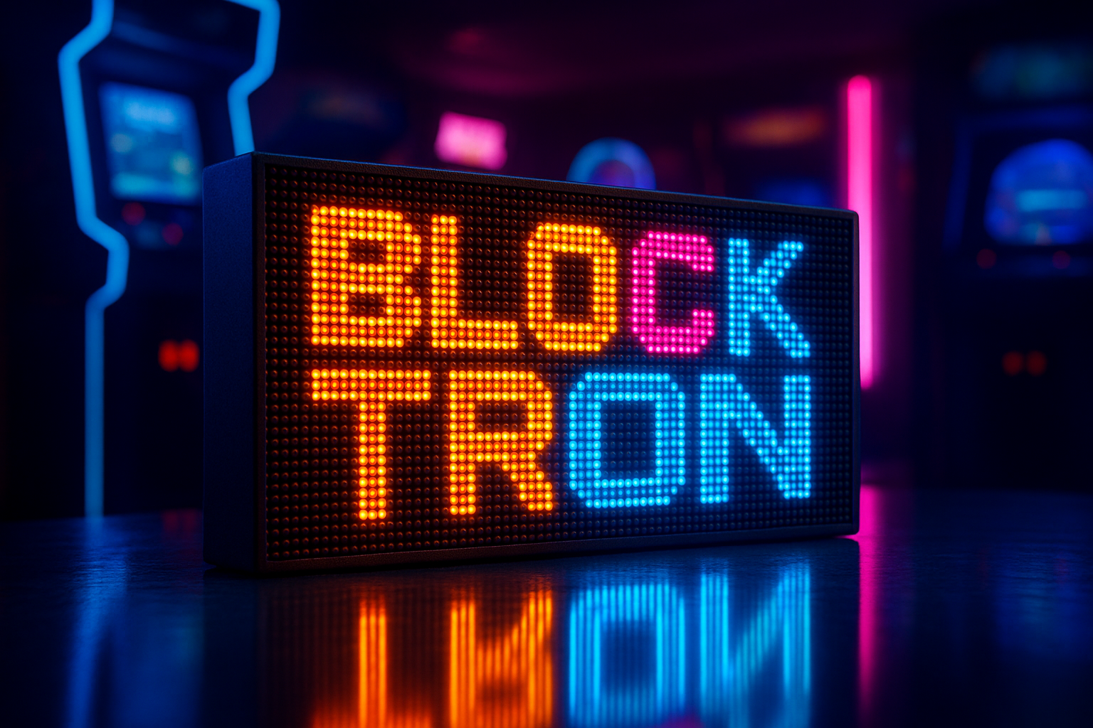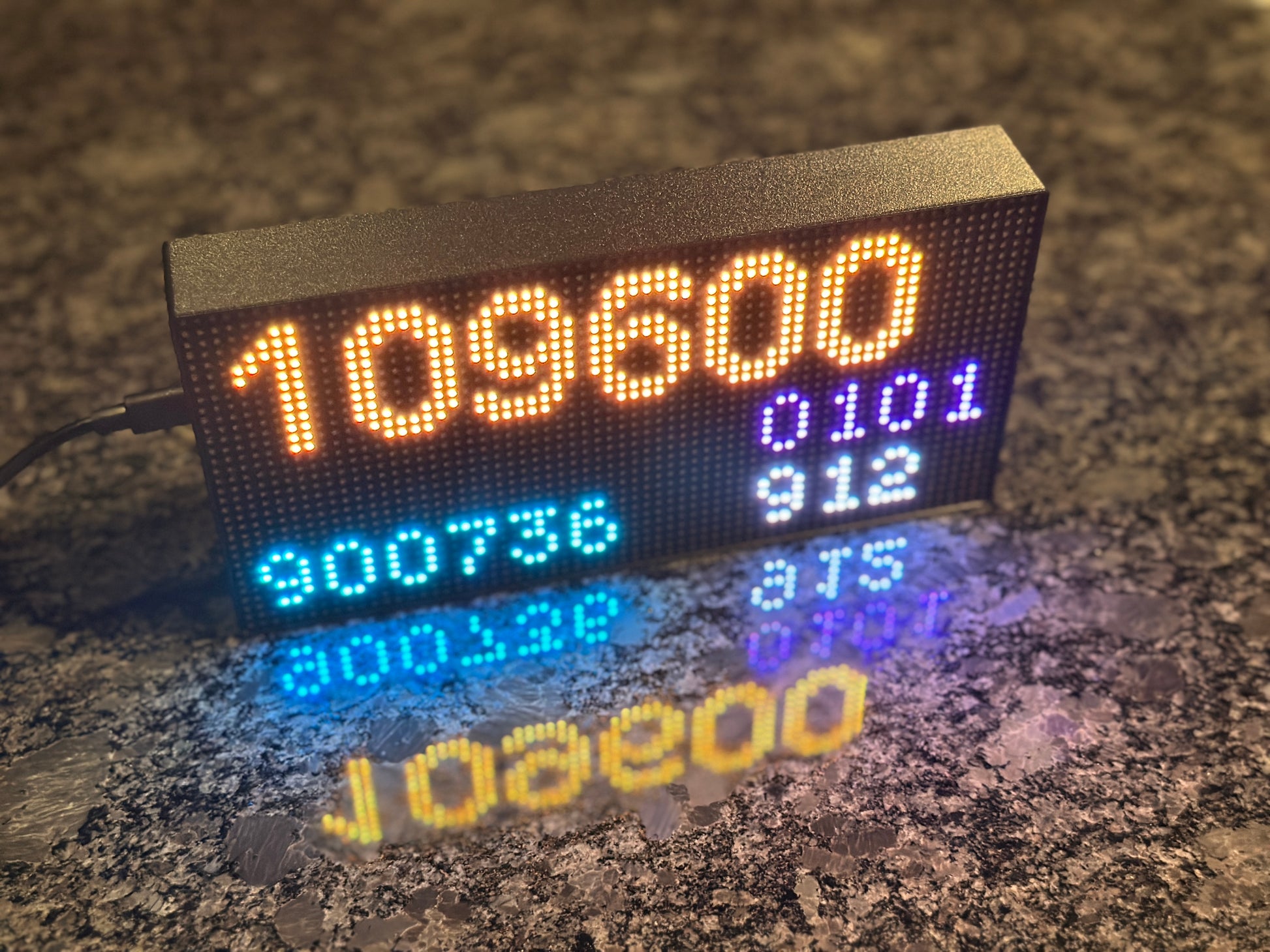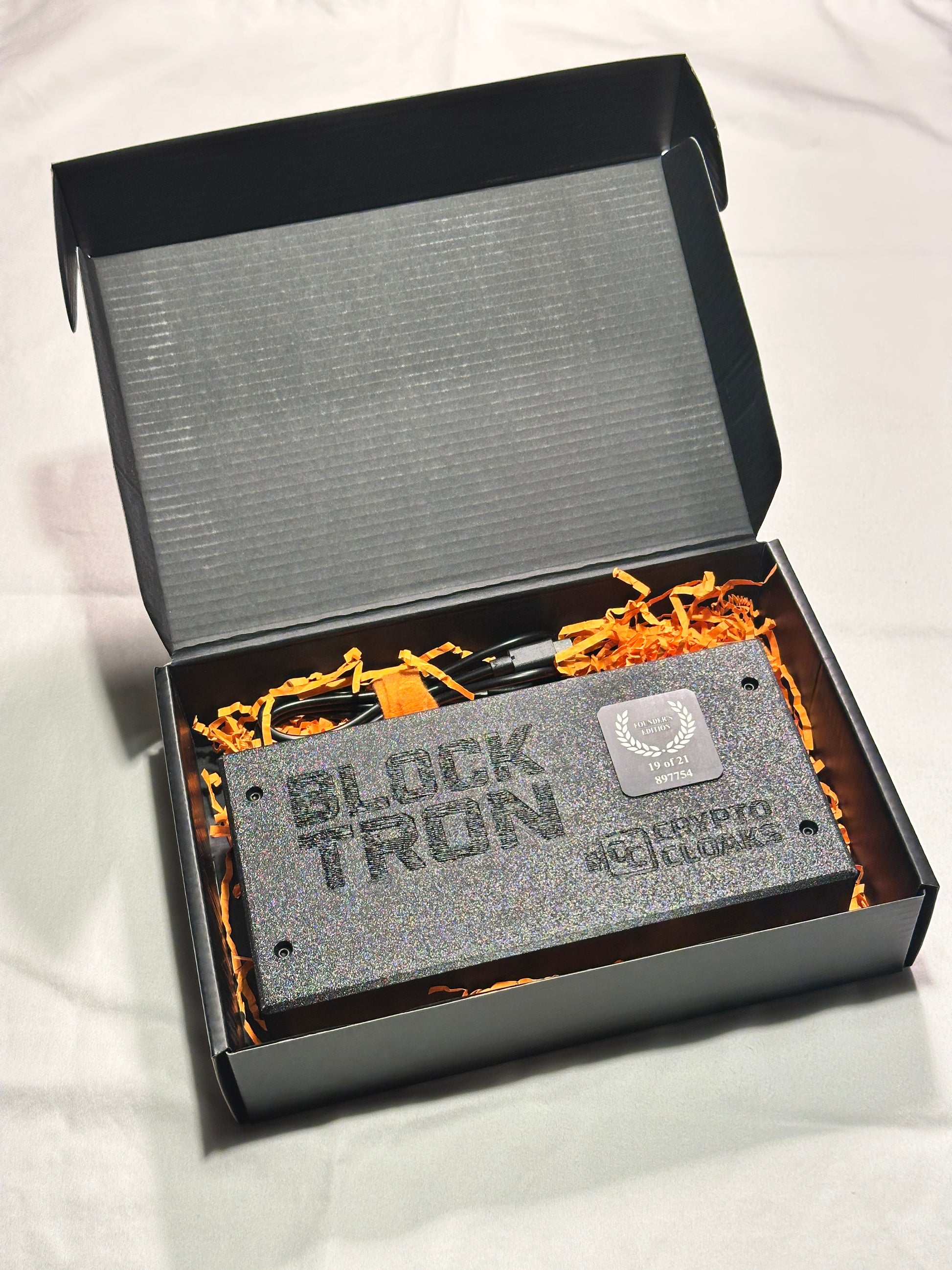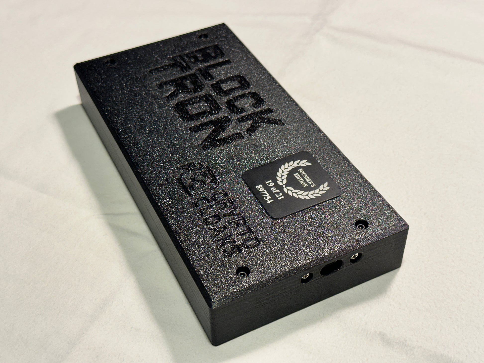 BlockTron Founders Edition. Extremely limited first run of 21 units produced, laser etched with block height when assembled and serialized out of 21 units. Features a vibrant 32x64 LED display with block height, Moscow time, current time of day and bitcoin USD price with Bitcoin network stats in a scrolling ticker. Requires a Wi-Fi Internet Connection. Package includes LED display, USBC cable, and USB adapter.